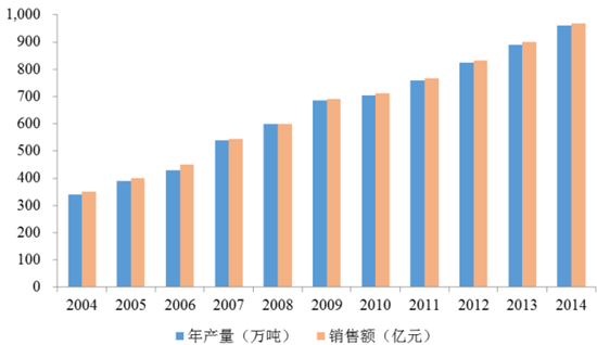 2004-2014 年食品添加劑主要產品年產量和銷售總額